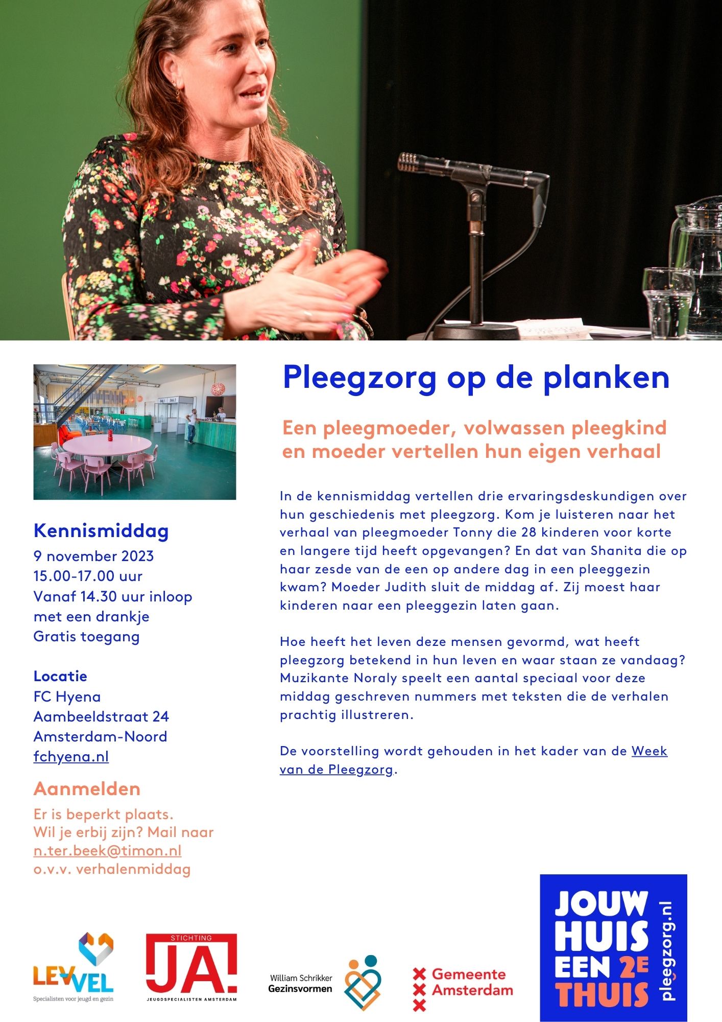 Deze week is het de week van de Pleegzorg. Stichting Ja, Levvel, William Schrikker Gezinsvormen en de gemeente Amsterdam organiseren Pleegzorg op de Planken: een verhalenmiddag over pleegzorg. Zie ook